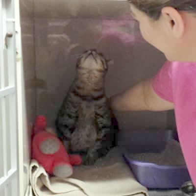 A cat meows and moans while a woman scratches its back/ butt at a vet.