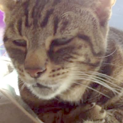 A one-eyed cat being scratched on the ground purrs, sounds like an owl / bird. Odd / weird.