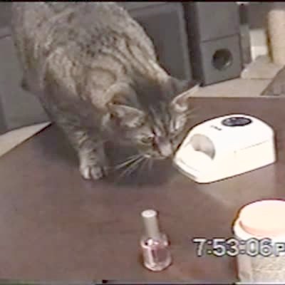 Woman puts her fingers into automatic fingernail dryer. Cat hops onto table & puts its paw into it. Silly pet trick.