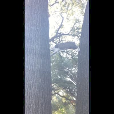 Beagle dog chases mountain lion through the woods & bites the big cat's tail. Mountain lion climbs up a tree, dragging dog up with him. Dog lets go and falls about 20 feet. Hard to see - shot at a distance. bobcat. Odd. Amazing. NO tails.