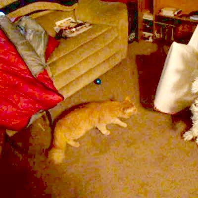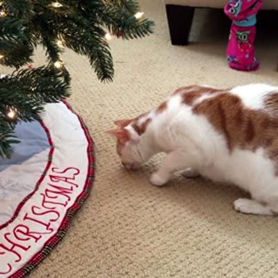 A cat sneaks up on a Christmas Tree toy indoors. The toy has a motion sensor that turns it on, so when the cat gets close, the face on the tree comes alive and it sings Christmas songs and the cat runs away scared. AA: Christmas