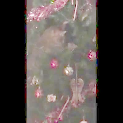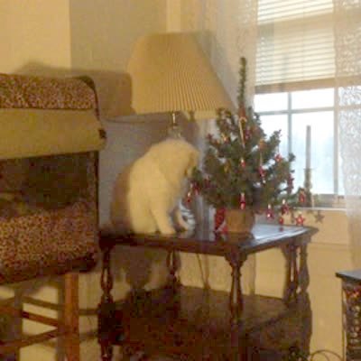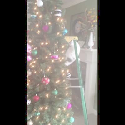 X-mas; Kitten follows light and jumps up Christmas tree. cat