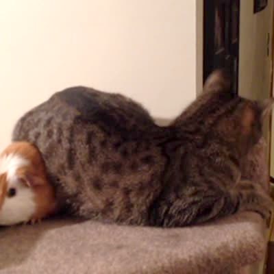 A cat paws at a guinea pig on a cat tree repeatedly while trying to push it off. The cat sits on the guinea pig and it squeals.