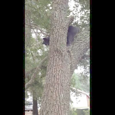 A bear cub is stuck on a tree branch at a zoo and jumps to climb a tree, but can't.