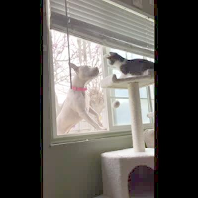 A dog jumps up and down to try to get a cat sitting at the top of cat tree. The dog is outside and the cat is on the other side of the window.