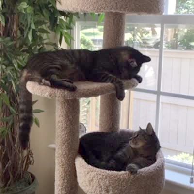 A Sphynx kitten cat watches an adult Sphynx cat's tail while they are on a cat tree in a living room, then she climbs on him and plays with his tail. They fall off of the cat tree together.