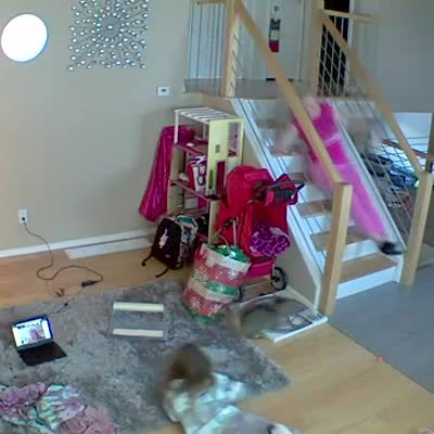 A cat perched on a cat tree indoors swats at a tot girl's ponytail hair as she runs by and she is stuck there.