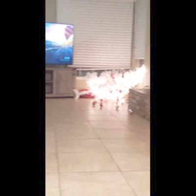 A cat in the living room leans against a lamp shaped like a leg (from A Christmas Story) and runs away when it falls over into a Christmas tree. Security Footage.