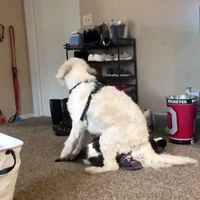 A dog whines with a cat's tail over her eyes in a living room, then the cat moves, and she stops.