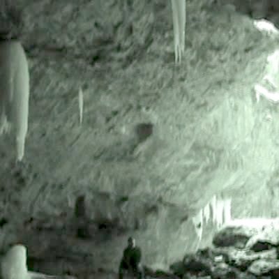Man throws a rock at a giant icicle and it falls with a loud noise / sound.