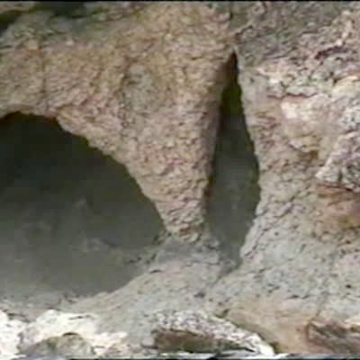 A man falls upside down while he explores a cave with his friends. He is suspended in the air upside down.