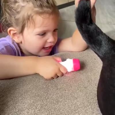 "To The Butt Cave!" A tot girl holds a dogs tail up and looks at its butt with a flashlight and says "I see a cave" in the living-room. A woman says "Leave her alone."