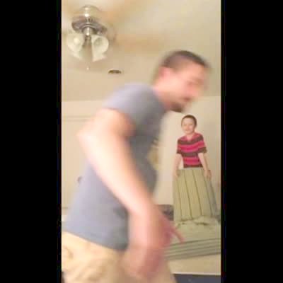 A woman in the living room demonstrates how to skip. A man says, "That's not how you skip, you need more room!" The husband tries to skip but he hits his head against a lightbulb and breaks it.