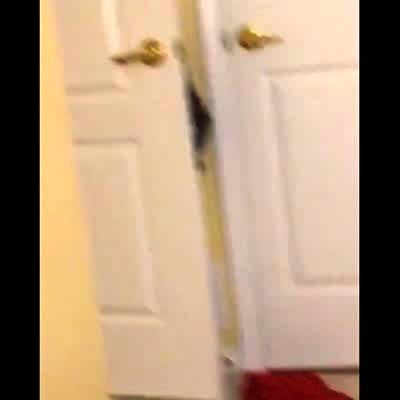 A man gets startled when a squirrel jumps on his back as he rings a doorbell. He then takes a selfie with it. Security footage.