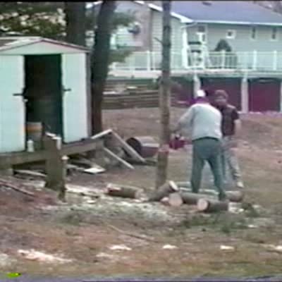 Man cuts down a tree near a trailer house. Tree falls and crushes roof. Men try to turn off electricity and gas lines to the house.