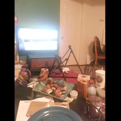 In a living room, two women put ornaments on a Christmas tree. One stands on a chair and puts the topper on the tree. She dances, the chair falls over, and she falls to the floor, hard.