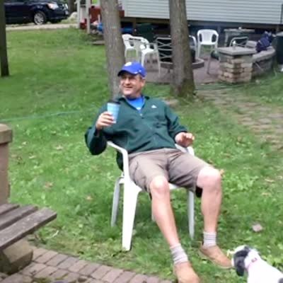 A man sits in a chair in the yard and a dog jumps into his lap and he tips backwards and falls.