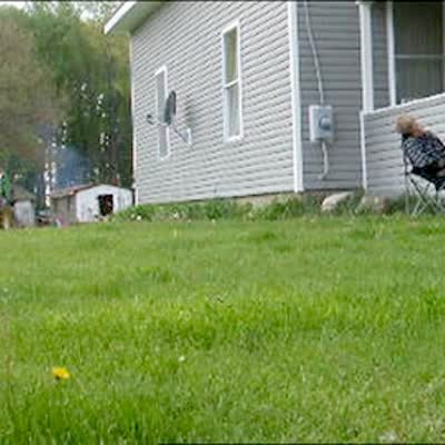 Teen boy sleeps in a chair in the yard. Man drives up in a tractor with a bucket of water on the end. Tractor guy tips the bucket up and pours the water on the sleeping teen. He gets up and chases the tractor, slips on the grass a few times. Practical joke/prank.