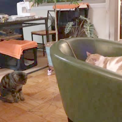 Man plays harmonica & cat cimbs onto the top of his recliner chair. Chair falls backwards.
