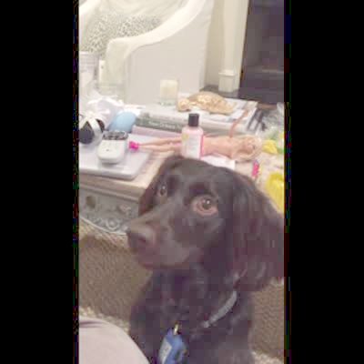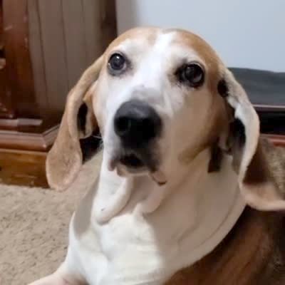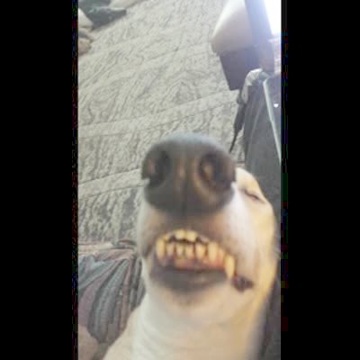 A dog's teeth chatter in response to "are you cold?" while in a living room.