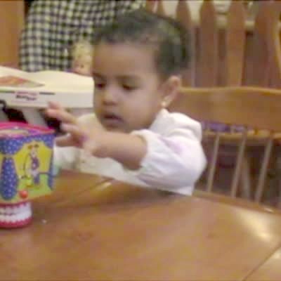 A girl tot sits in a chair at a dining table and makes a funny face when she sees a chattering teeth toy for the first time.