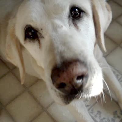 Big white dog lays on the kitchen floor and chatters his teeth when woman off-camera asks dog if it's cold. Silly pet tricks.