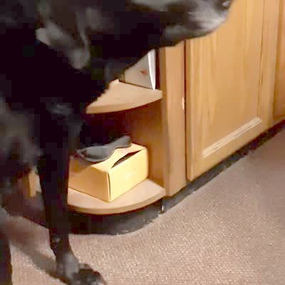A black Labrador retriever dog's teeth make a vibrate sound when they chatter in a kitchen, and a woman asks her if she is cold.
