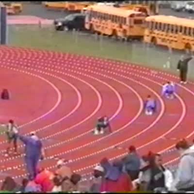 Teen in 400 meter dash race, cuts across the infield to win race.