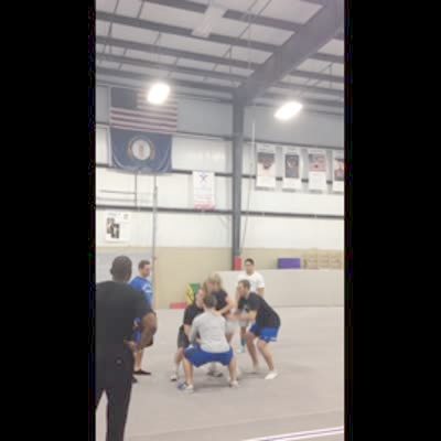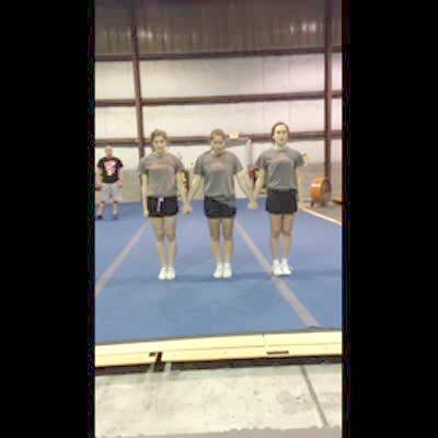 The teen basket for a cheer leading stunt falls as the flyer hits them with her feet.