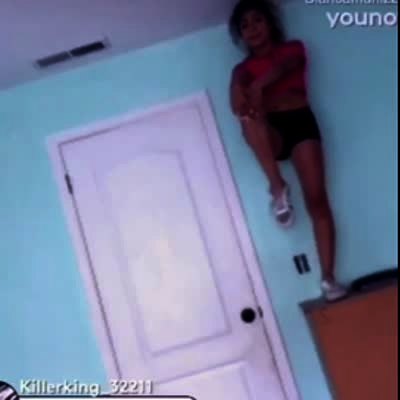 A teen girl falls after the dresser she stands on tips over while she practices a cheer-leading routine.
