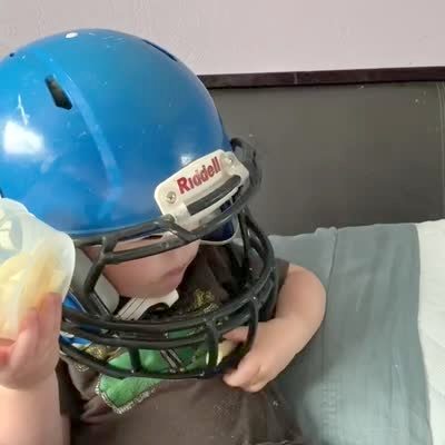 A tot boy struggles to get a Cheeto through his football helmet in the living room. When he finally gets the snack a woman tells him "good job".