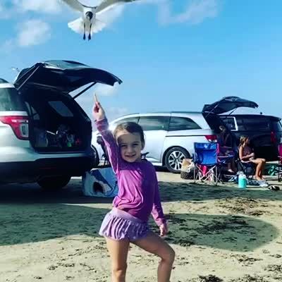 A bird steals a Cheeto from a young girl's hand at a beach. Slow motion.