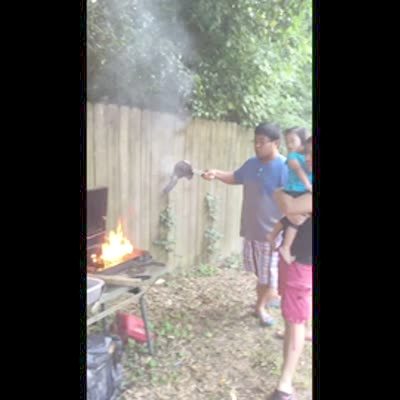 A dad tries to cook an onion volcano and it catches on fire on a hibachi grill in a kitchen and a young girl and young boy look scared.