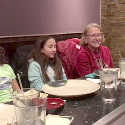 A family sits at a table at Hibachi Grill and a senior woman falls off her chair when the chef lights a fire at the table.