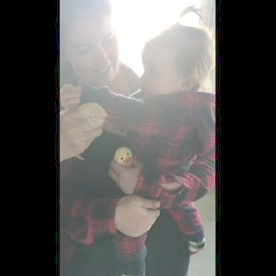 A woman records a selfie with a baby chick chicken bird on her shoulder in the living room and it pecks at her eye. Snapchat filter: flower ears and glasses.