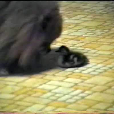 Back Off! Baby chick makes dog cower and back away.