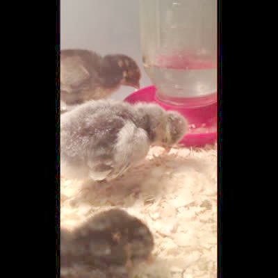 A baby chicken chick falls asleep while standing up in a cage and then perks up.