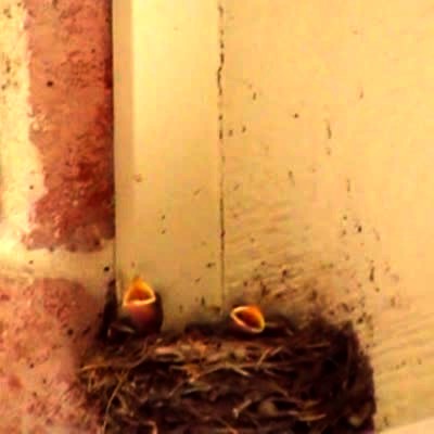 A man films a bird nest of baby birds and has his daughters scream, causing the baby birds to all stretch their necks up and squeak/chirp together.