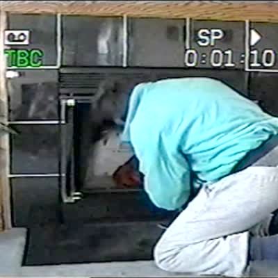 "Bushy-Tailed Break-In" Man & woman try to get squirrel out of their chimney with a bag. When man tries to pick it up, the squirrel runs through the house & eventually goes outside. Long for edit.