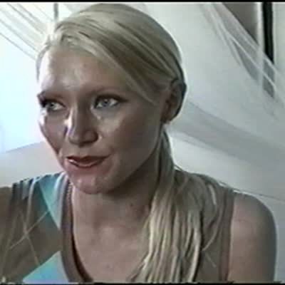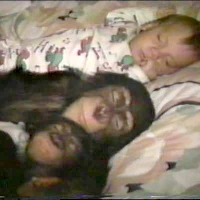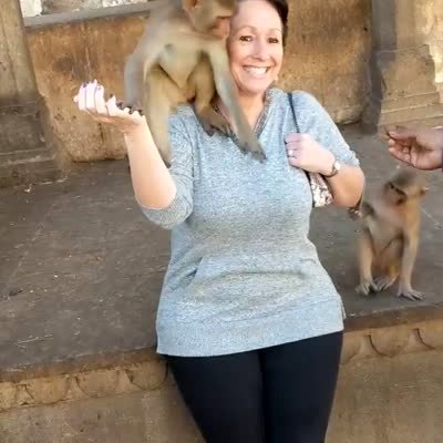 A woman stands next to a monkey outside. He tries to get near it to take a picture. Then another monkey unexpectedly jumps on her shoulders. She screams. The monkey takes food from the woman's hand. Featured talent only (woman who gets startled).
