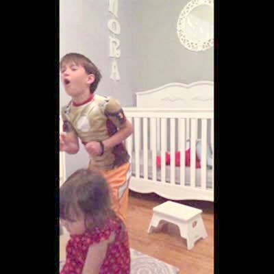 A young boy jumps off a footstool and his chin hits his tot sister in the head in slow motion.