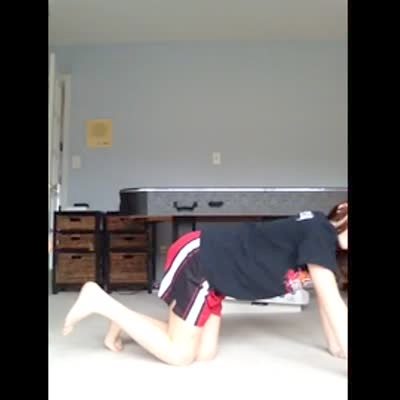 Baby does fake chin-ups over the edge of a table. Mom is pushing her up.