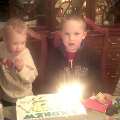 Two boys and their parents sing "happy birthday" into camera for somebody. At 0:23, one of the boys jumps and head butts mom under chin.