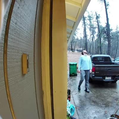 A man struggles to catch a snowflake and hits his chin on the truck in the driveway. Security footage.