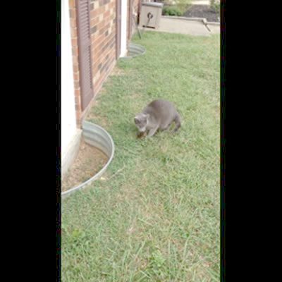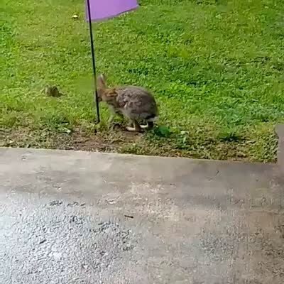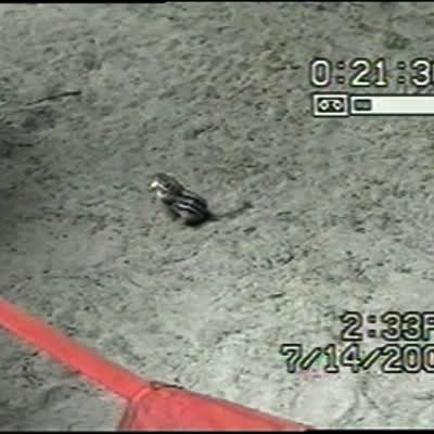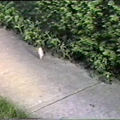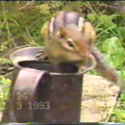 When a chipmunk runs from a flower pot and into a house, a woman screams from the porch while a man screams back "what did you do?" Security footage.