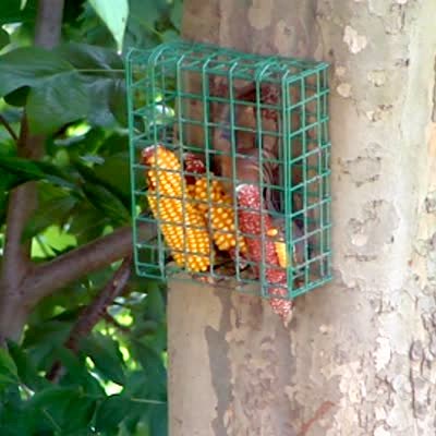 A chipmunk eats corn in a cage mounted to a tree. It fills up its cheeks and can't squeeze through the openings so it spits all the corn on the ground and climbs out.