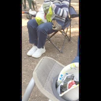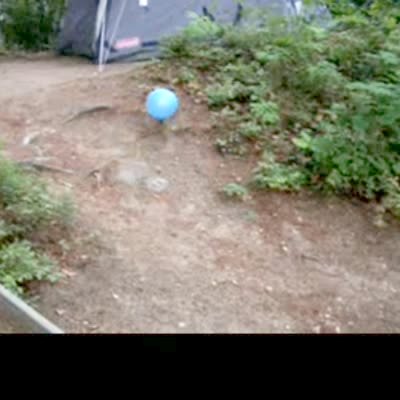 A chipmunk runs around a camp site with a balloon in its mouth. It gets stuck in some brush as kids and adults laugh at it. (Per owner, they have addtl footage of chipmunk for ending of clip...more tails).