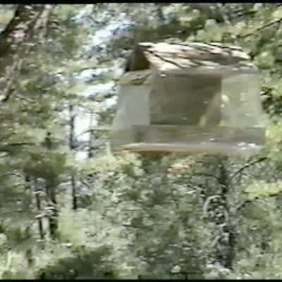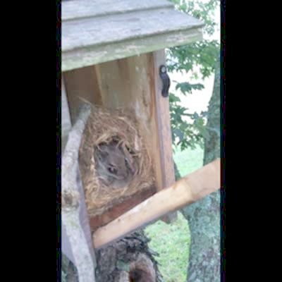 A man looks into a birdhouse and gets scared by a chipmunk. He tries to poke it at 0:38 and screams.