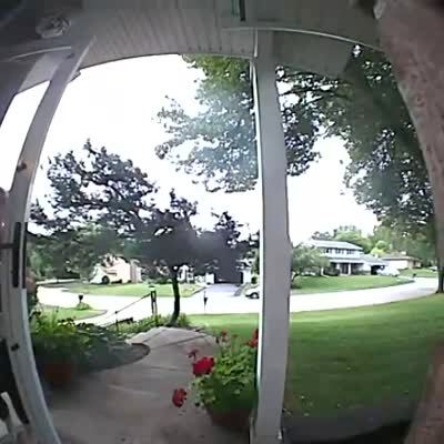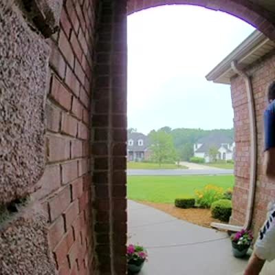 Security footage of a teen boy who curses and runs back in the house after a chipmunk jumps at him when he walks on to the front porch.