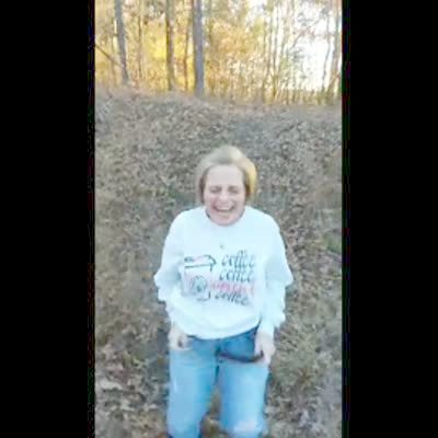 A woman screams when a chipmunk jumps on her while she is holding food outdoors.